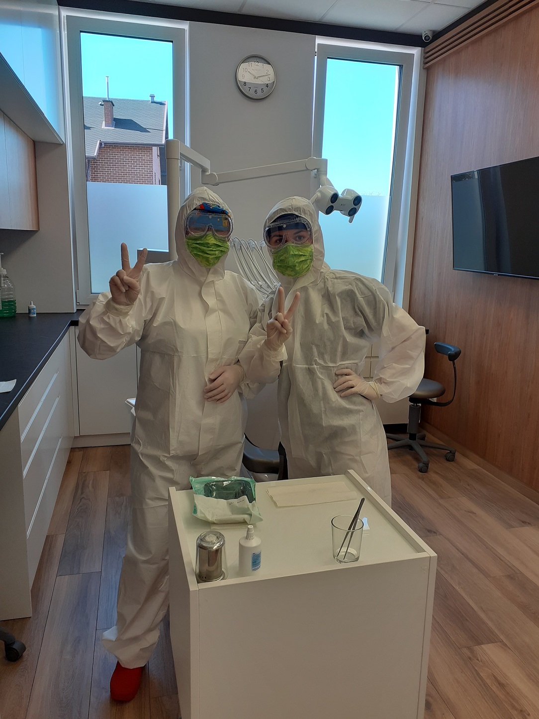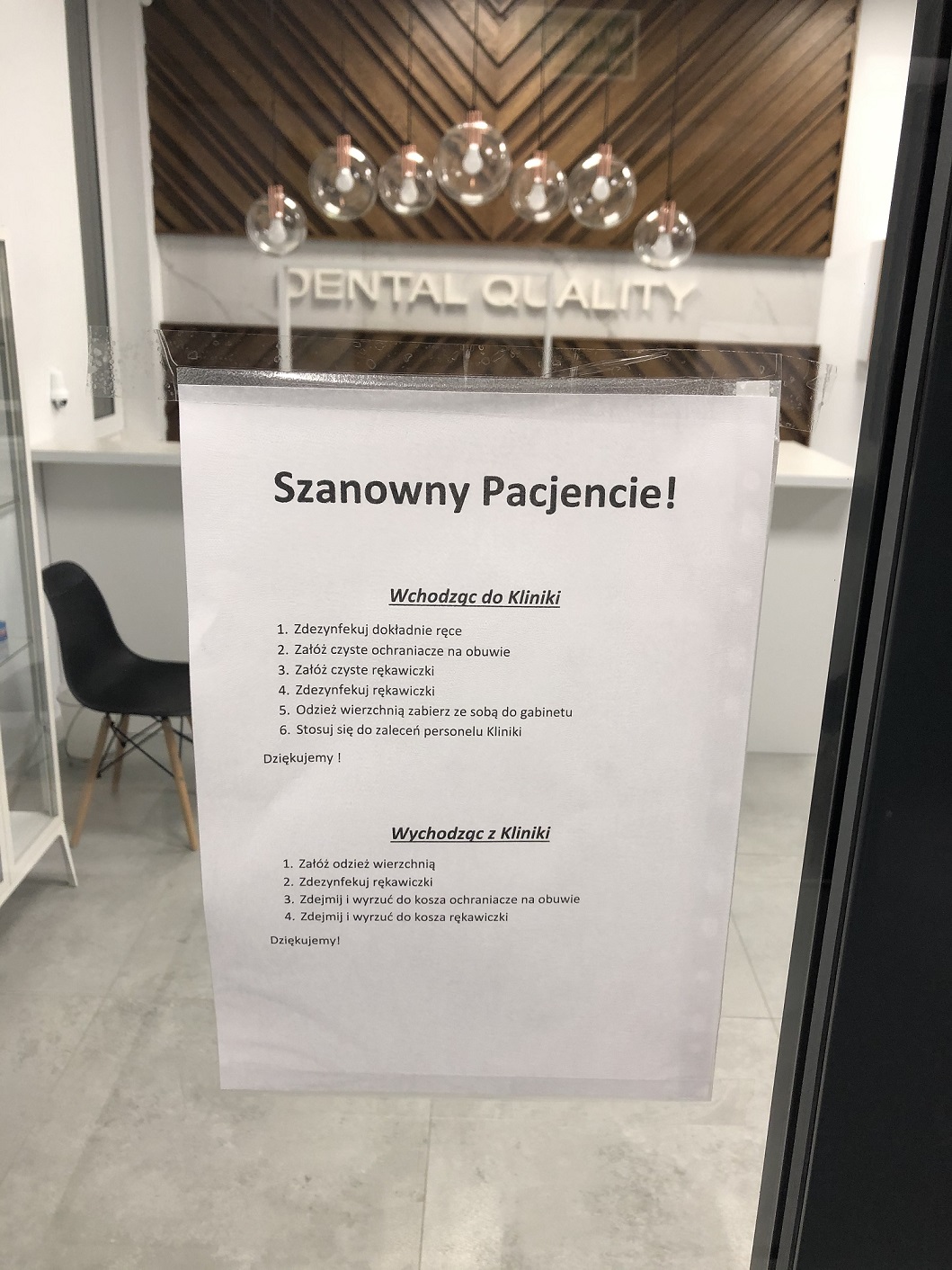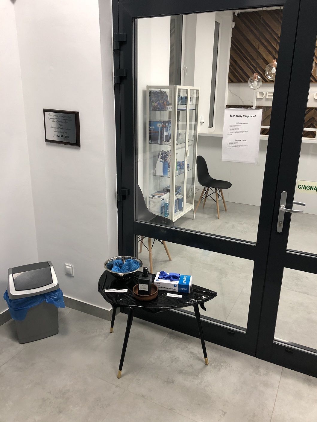 Każdy pacjent wchodzący do kliniki przychodzi w maseczce, na miejscu w przedsionku przygotowany jest płyn dezynfekcyjny, rękawiczki i ochraniacze na buty. Następnie w poczekalni przechodzi kontrolę epidemiologiczną poprzez pomiar temperatury ciała bezdotykowym termometrem oraz ponownie odpowiada na pytania z wywiadu epidemiologicznego. Również dotyczy to samo osoby towarzyszącej (w przypadku osób niepełnoletnich, bądź wymagających opieki).
