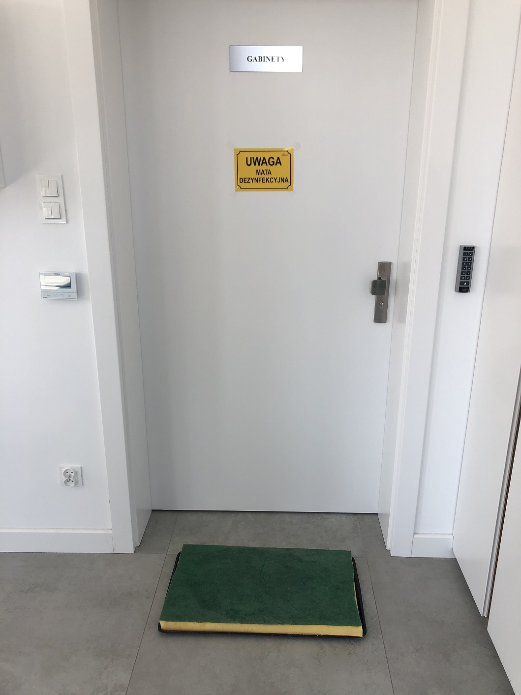 Wchodząc i wychodząc z gabinetu pacjent przechodzi przez matę dezynfekcyjną, co w połączeniu z ochraniaczami na obuwie, minimalizuje ryzyko rozprzestrzeniania się patogenów zgromadzonych na podłodze.