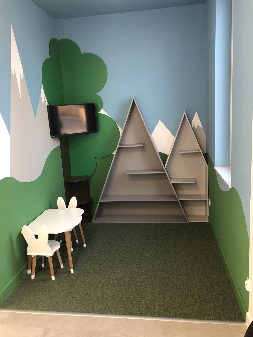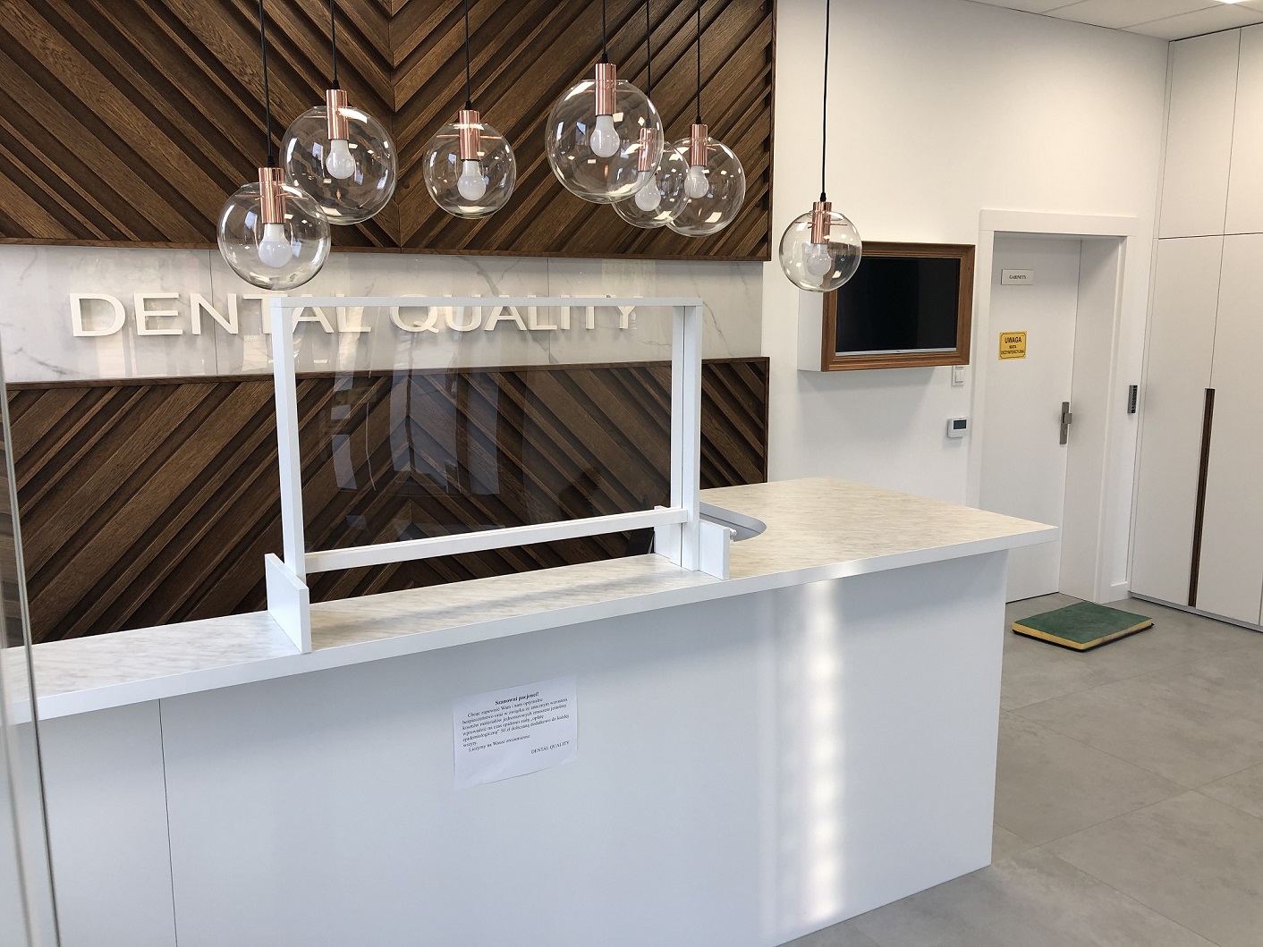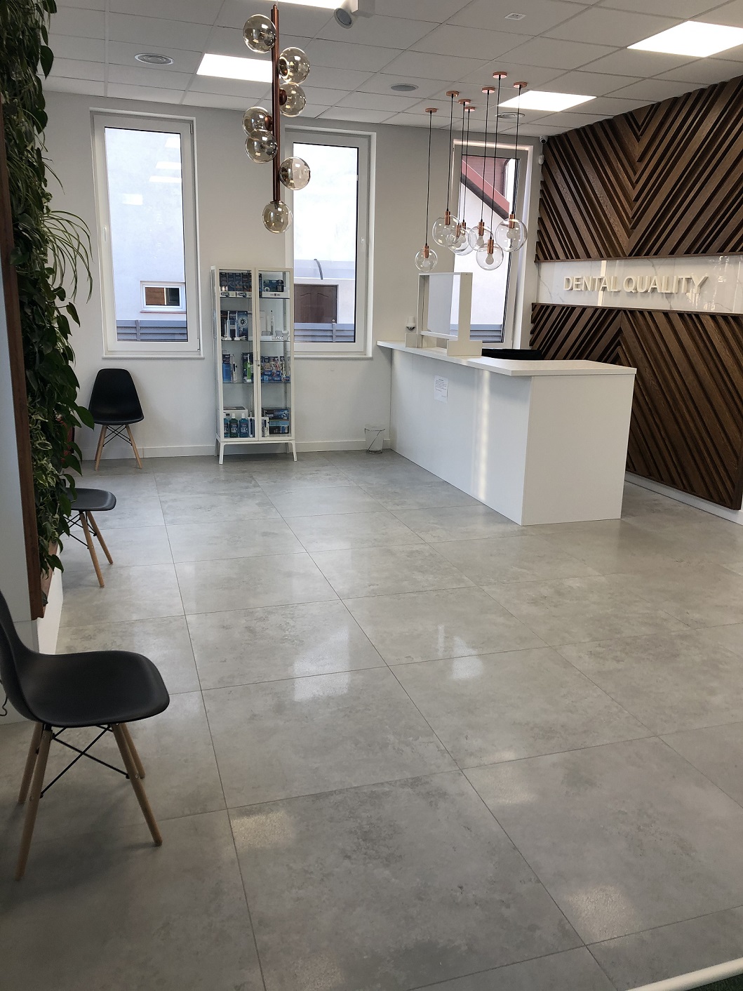 Poczekalnia w tym momencie świeci pustkami, nie znajdziecie Państwo wygodnych sof i foteli, zamiast tego są pojedyncze, łatwo zmywalne krzesła. Staramy się umawiać pacjentów w pewnych odstępach czasowych, jeżeli jednak zdarzy się, że znajduje się dwóch pacjentów na poczekalni zaleca się zachowanie bezpiecznej odległości (min. 2m). oraz wypełnianie niezbędnych dokumentów przez specjalnie przygotowane okienko, które mieści się w płycie pleksiglasowej.