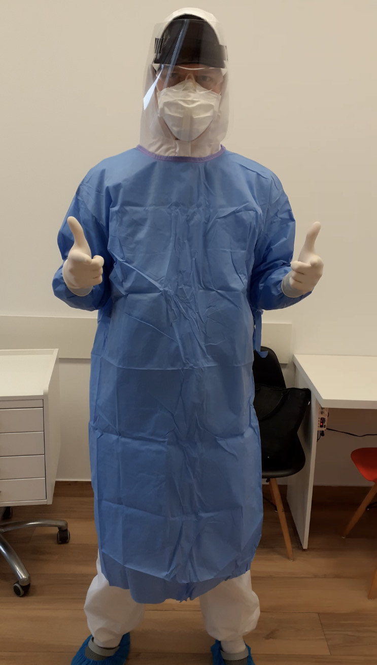 Personel medyczny zabezpieczony jest warstwowo w odzież ochronną, maseczki z filtrem, maseczki chirurgiczne, dwie pary rękawic, gogle oraz przyłbice. Tak przygotowani koordynują dalszy proces przyjmowania pacjenta już w gabinecie.